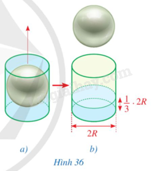 Đặt hình cầu nằm khít trong cốc hình trụ rồi đổ đầy nước vào cốc đó (Hình 36a). Nhấc nhẹ hình cầu ra khỏi cốc. Đo độ cao cột nước còn lại, ta thấy độ cao này chỉ bằng \(\frac{1}{3}\) chiều cao của cốc (Hình 36b). Hãy cho biết thể tích của hình cầu bằng bao nhiêu phần thể tích của cốc hình trụ.