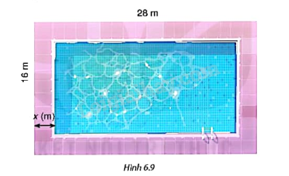 Tình huống mở đầu: Trên một mảnh đất hình chữ nhật có kích thước 28m x 16m, người ta dự định làm một bể bơi có đường đi xung quanh (H.6.9). Hỏi bề rộng của đường đi là bao nhiêu để diện tích của bể bơi là \(288{m^2}\)?