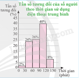 Vì số người có thời gian sử dụng điện thoại thuộc khoảng [90; 120) chiếm 40% nên số người được hỏi có thời gian sử dụng điện thoại thuộc khoảng đó là 40%.150 = 60 (người).