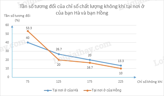 a) Hãy vẽ trên cùng một hệ trục hai biểu đồ dạng đoạn thẳng biểu diễn tần số tương đối cho bảng chỉ số chất lượng không khí tại nơi ở của bạn Hà và tại nơi ở của bạn Hồng