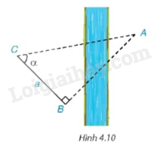 Để tính khoảng cách giữa hai địa điểm A, B không đo trực tiếp được, chẳng hạn A và B là hai địa điểm ở hai bên sông, người ta lấy điểm C về phía bờ sông có chứa B sao cho tam giác ABC vuông tại B. Ở bên bờ sông chứa B, người ta đo được \(\widehat {ACB} = \alpha \) và \(BC = a\) (H.4.10) . Với các dữ liệu đó, đã tính được khoảng cách AB chưa? Nếu được, hãy tính AB, biết \(\alpha = {55^0},a = 70\) m.