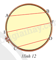Bạn Mai căng ba đoạn chỉ AB, CD, EF có độ dài lần lượt là 16 cm, 14 cm và 20 cm trên một khung thêu hình tròn bán kính 10 cm (Hình 12). Trong ba dây trên, dây nào đi qua tâm của hình tròn? Giải thích.