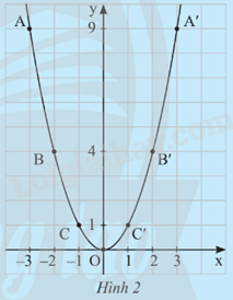 Từ bảng trên, ta lấy các điểm A(-3;9), B(-2;4), C(-1;1), O(0;0), C’(1;1), B’(2;4), A’(3;9) trên mặt phẳng tọa độ Oxy. Đồ thị của hàm số \(y = {x^2}\) là một đường cong đi qua các điểm nêu trên và có dạnh như Hình 2.