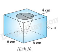 Từ một khối gỗ có dạng hình lập phương cạnh 6 cm, người ta khoét một hình nón có đường kính mặt đáy là 4 cm và đỉnh của hình nón chạm vào mặt đáy của khối gỗ (Hình 10). Hãy tính thể tích của phần khối gỗ còn lại (kết quả làm tròn đến hàng đơn vị).