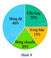 Biểu đồ hình quạt tròn ở Hình 9 biểu diễn kết quả thống kê (tính theo tỉ số phần trăm) chọn môn thể thao ưa thích nhất trong 4 môn: cầu lông, bóng bàn, bóng chuyền, bóng đá của 300 học sinh khối lớp 9 ở một trường THCS. Mỗi học sinh chỉ được chọn 1 môn thể thao khi được hỏi ý kiến.