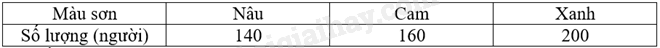 Để chuẩn bị đưa ra thị trường mẫu sản phẩm mới, một hãng sản xuất đồ nội thất tiến hành thăm dò mẫu sơn mà người tiêu dùng ưa thích. Hãng sản xuất đó đã hỏi ý kiến của 500 người mua hàng và nhận được kết quả là: 140 người thích màu nâu, 160 người thích màu cam, 200 người thích màu xanh. Vẽ biểu đồ hình quạt tròn biểu diễn các số liệu đó.