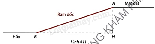 Độ dốc của ram dốc AB từ mặt đất xuống tầng hầm được tính bằng tỉ số của chiều sâu AH và chiều dài BH của phần đường hầm dành để xây dựng ram dốc (Hình 4.11). Theo quy chuẩn kĩ thuật quốc gia về công trình ngầm đô thị (QCVN 08:2009/BXD, phần 2- về gara ô tô), ram dốc thẳng cần có độ dốc không lớn hơn 18%. Em hãy cho biết ram dốc trong Hình 4.11 có đạt chuẩn về độ dốc không, nếu góc nghiêng ABH của ram dốc so với phương ngang là: