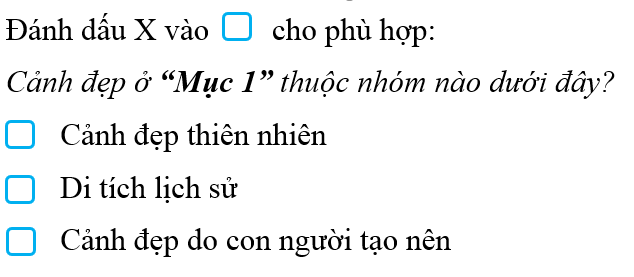 - Đầu tiên em cần hiểu rõ các đáp án mà đề bài cho. Cảnh đẹp thiên nhiên là cảnh đẹp như thế nào? Di tích lịch sử là gì? Cụ thể: Cảnh đẹp thiên nhiên là cảnh đẹp có sẵn ngoài tự nhiên, không có sự tác động của con người; di tích lịch sử là địa điểm, công trình có giá trị lịch sử, văn hóa, khoa học.