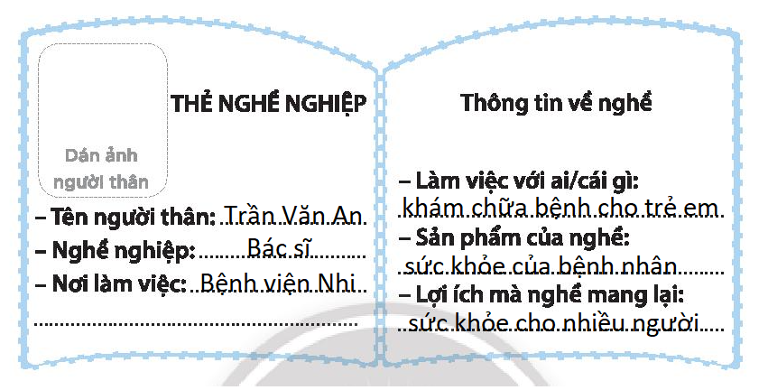 - Sau đó dựa theo mẫu được cho, trả lời những câu gợi ý trong mẫu để hoàn thành thẻ nghề nghiệp cho người thân.
