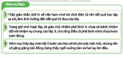 + Tình huống 2: X. có thể trực tiếp trao đổi với cô để bày tỏ ý kiến, quan điểm của mình về lời phê bình của cô. Luôn có thái độ lễ phép, tôn trọng và nhận trách nhiệm đối với những việc mình làm sai.