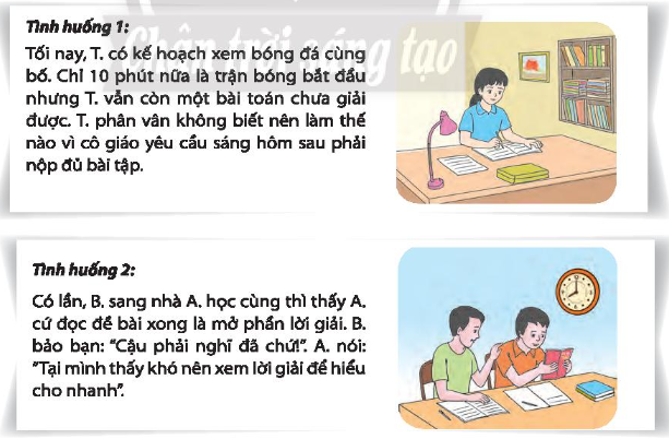 + Tình huống 1: Nếu là T, em sẽ tiếp tục ngồi giải bài toán đó và chỉ ra xem bóng đá với bố sau khi đã hoàn thành xong hết các bài tập.