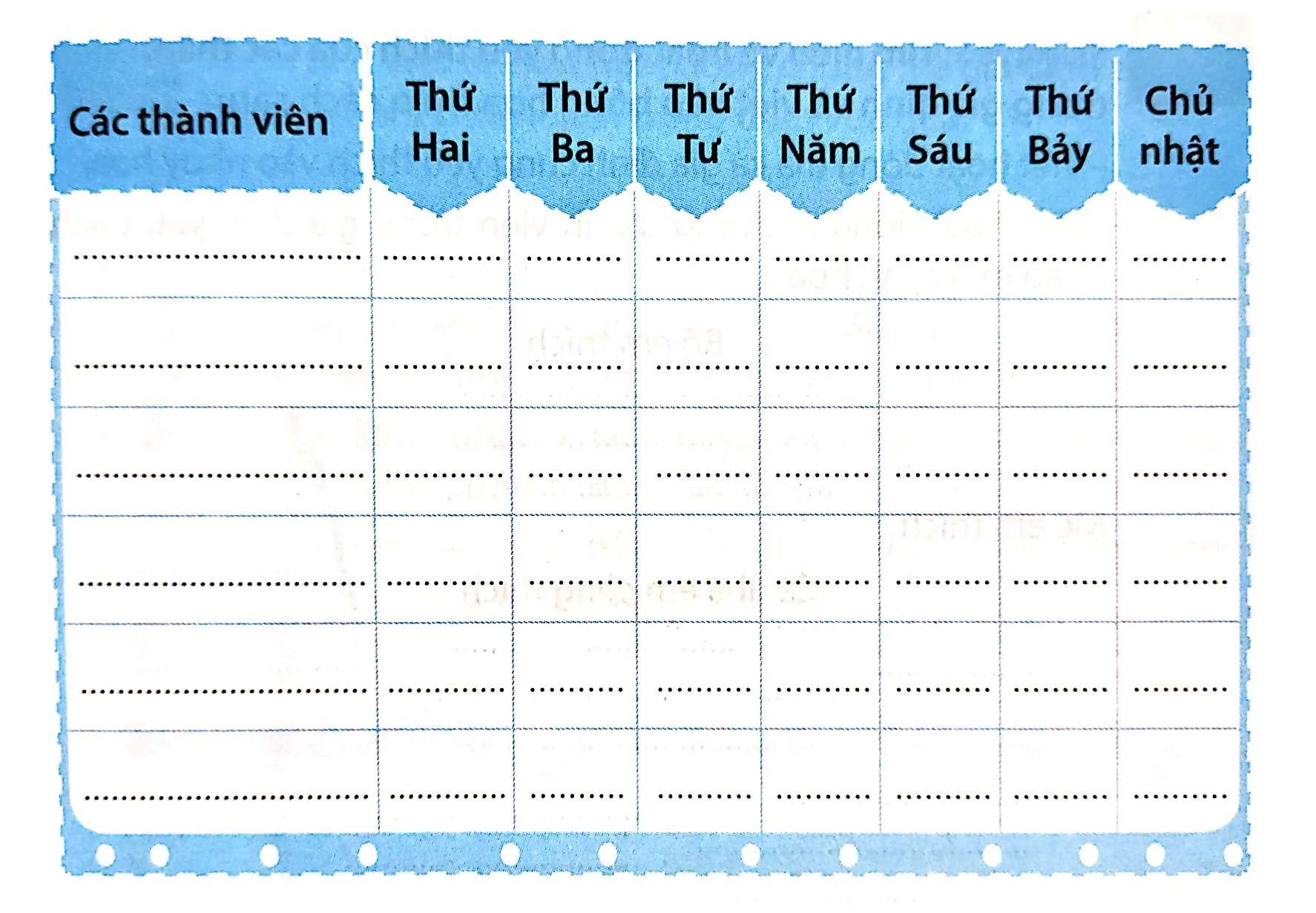 Tìm hiểu về thời gian biểu của các thành viên trong gia đình và ghi vào bảng sau: