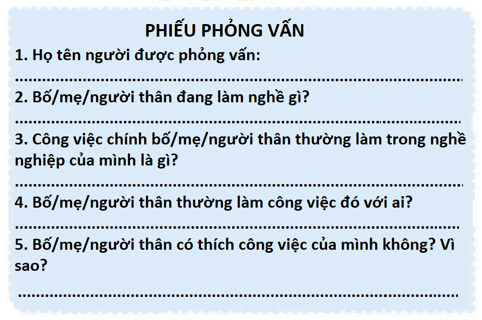 Phỏng vấn ngắn bố, mẹ hoặc người thân về công việc chính trong nghề nghiệp theo gợi ý: