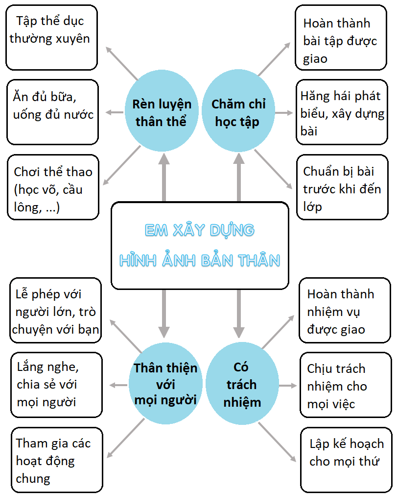 - Đầu tiên, em cần đọc kĩ gợi ý của đề bài về những việc làm để xây dựng hình ảnh bản thân của em. Cụ thể trong bài có 4 gợi ý: rèn luyện thân thể, chăm chỉ học tập, thân thiện với mọi người, có trách nhiệm.