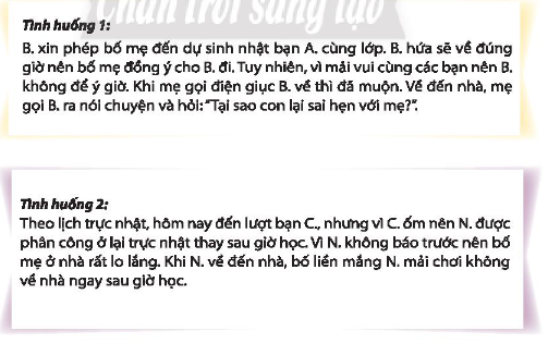 + Tình huống 1: Chủ động xin lỗi mẹ và nói rõ lí do vì sao mình lỡ hẹn với mẹ, hứa với mẹ từ sau sẽ về nhà đúng giờ để bố mẹ không lo lắng.