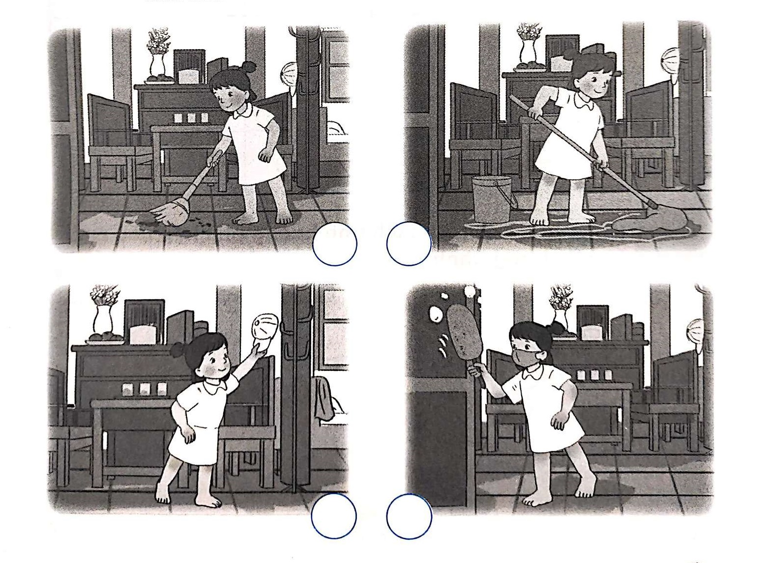 - Tương tự như bài tập 1, việc đầu tiên em cần làm đó chính là nhìn vào tranh, xác định từng công việc cụ thể trong tranh. Các công việc lần lượt là quét nhà, lau nhà, cất gọn đồ dùng, lau bụi bẩn.