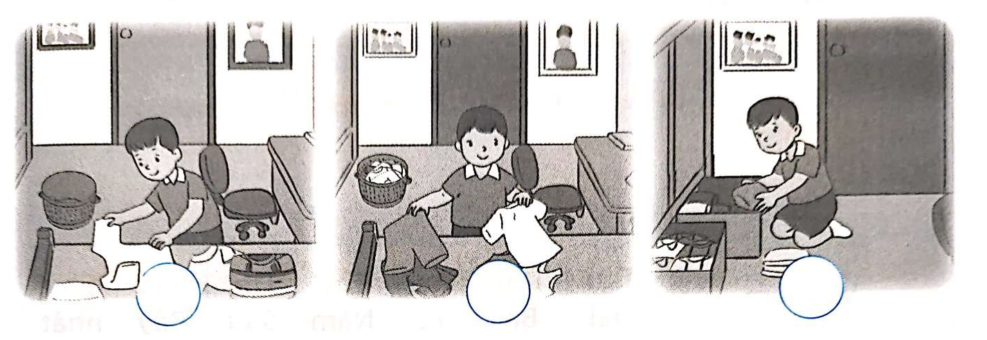 - Đầu tiên em cần nhìn vào tranh, xác định từng công việc cụ thể trong tranh. Các công việc lần lượt là gấp quần áo, phân loại quần áo, xếp quần áo đã gấp vào tủ.