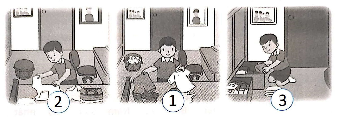 - Cụ thể: Trong tranh có 3 công việc là gấp quần áo, phân loại quần áo và cất quần áo vào tủ. Cất quần áo chắc chắn là công việc cuối cùng. Còn lại gấp quần áo và phân loại quần áo. Em tiếp tục nhìn kỹ vào tranh, giỏ đồ lúc phân loại vẫn còn quần áo, còn giỏ đồ lúc xếp đã hết quần áo. Từ đó em có thể đoán được phân loại quần áo trước rồi mới xếp quần áo.