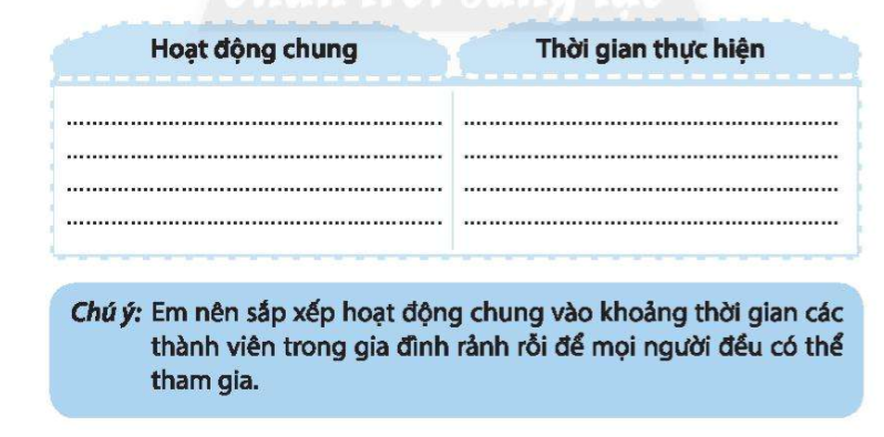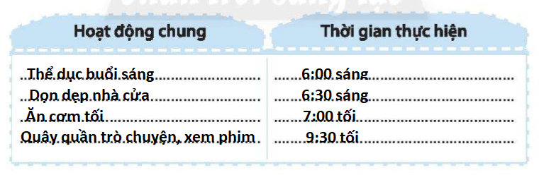 Dựa vào thời gian biểu của các thành viên trong gia đình, hãy lập thời gian biểu hoạt động chung của gia đình em.