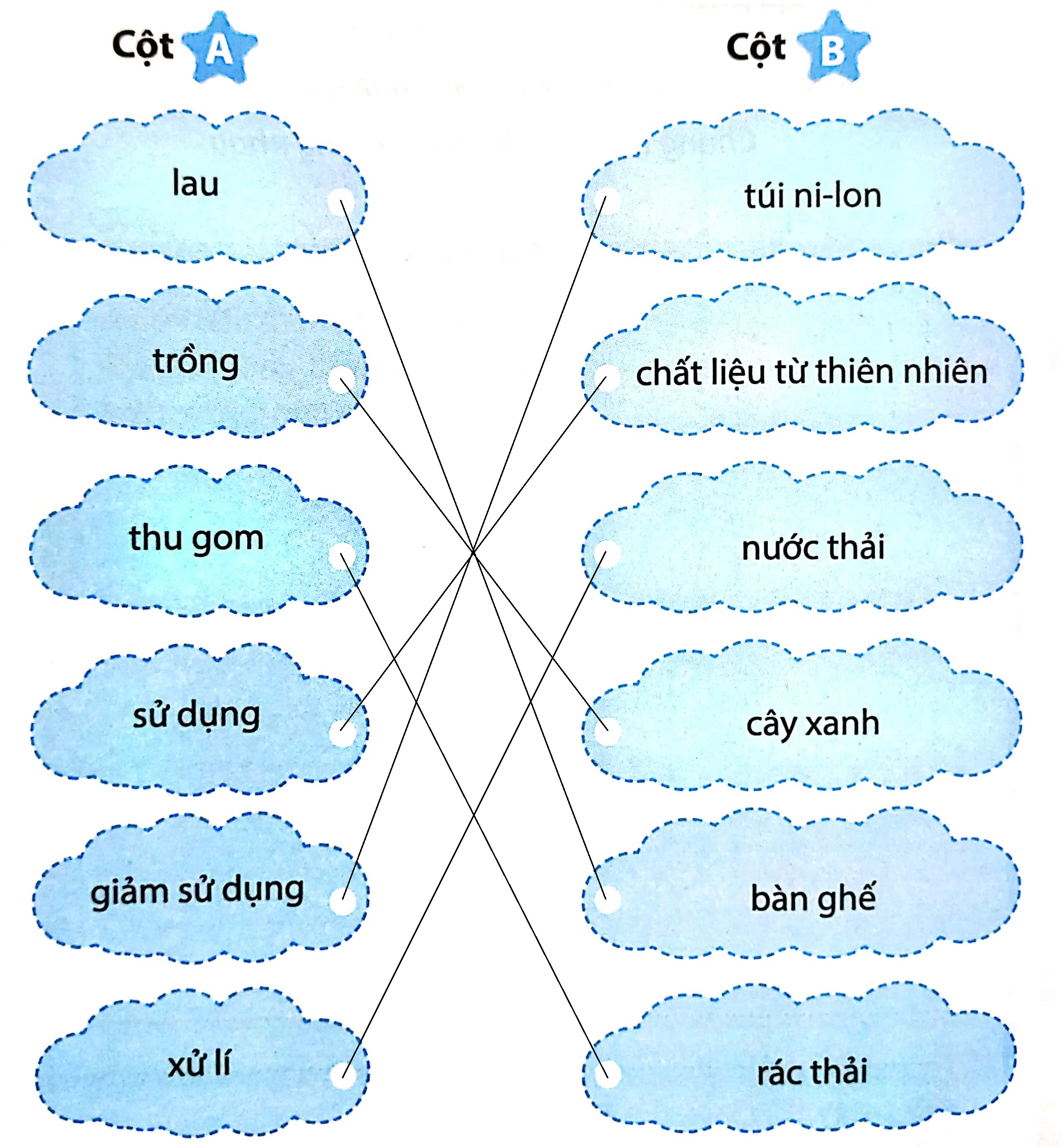 1. Nối một dòng ở cột A với một dòng ở cột B để tạo thành các việc làm góp phần giữ gìn vệ sinh và bảo vệ môi trường.