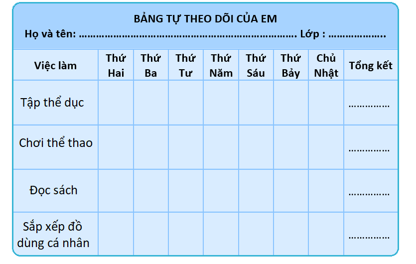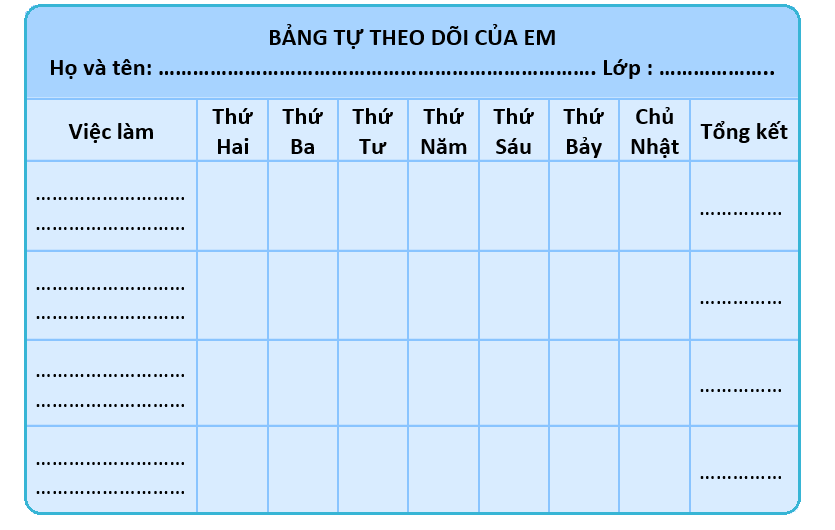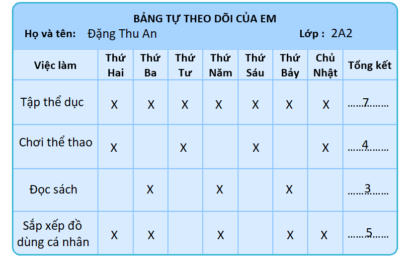 Đánh dấu X vào những ngày mà em thực hiện và điền số ngày thực hiện các việc làm đó vào cột “Tổng kết”.