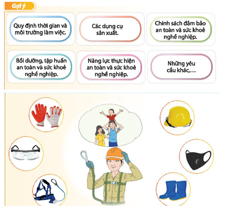 Thảo luận về những yêu cầu đảm bảo an toàn và sức khỏe nghề nghiệp trong hoạt động sản xuất, kinh doanh, dịch vụ ở địa phương. Trao đổi với người thân việc thực hiện an toàn và đảm bảo sức khỏe trong lĩnh vực nghề nghiệp của họ.