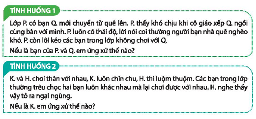 + Tình huống 1: Em cùng với các bạn trong lớp nói chuyện riêng với P, khuyên P không nên có hành vi và cách ứng xử như thế vì dù ở quê hay thành phố mọi người đều có quyền học tập và làm việc bình đẳng như nhau. Nếu bạn P không đồng ý và thay đổi thái độ, em sẽ báo với cô để cô cách khuyên P thay đổi thái độ của mình.