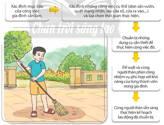 Lập kế hoạch lao động tổng vệ sinh nhà cửa theo các bước sau: Chia sẻ và xin ý kiến của người thân về kế hoạch lao động dọn dẹp nhà cửa em đã lập. Cùng người thân thực hiện kế hoạch đặt ra.