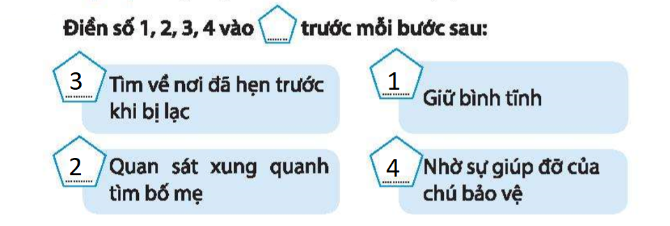 - Đầu tiên em cần đọc kĩ bước xử trí trong vở bài tập, sau đó đặt mình trong tình huống bị lạc. Nếu em bị lạc, thì trong em sẽ xử trí như thế nào? Tại sao em lại có cách xử trí như vậy?