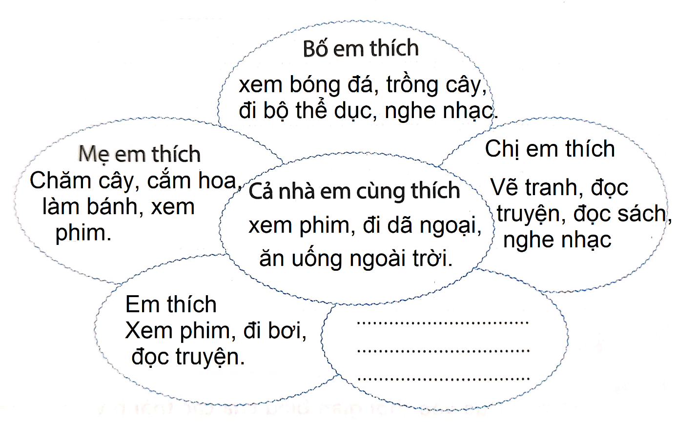 Tìm hiểu về hoạt động yêu thích của các thành viên trong gia đình và viết vào bông hoa theo cách sau: