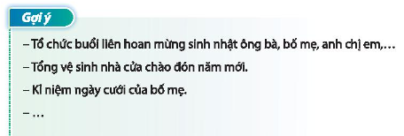 Trao đổi những việc làm thể hiện trách nhiệm với tình yêu thương của từng thành viên trong gia đình. Thiết kế một hoạt động chung để cả gia đình cùng tham gia và thể hiện trách nhiệm của từng thành viên trong gia đình.