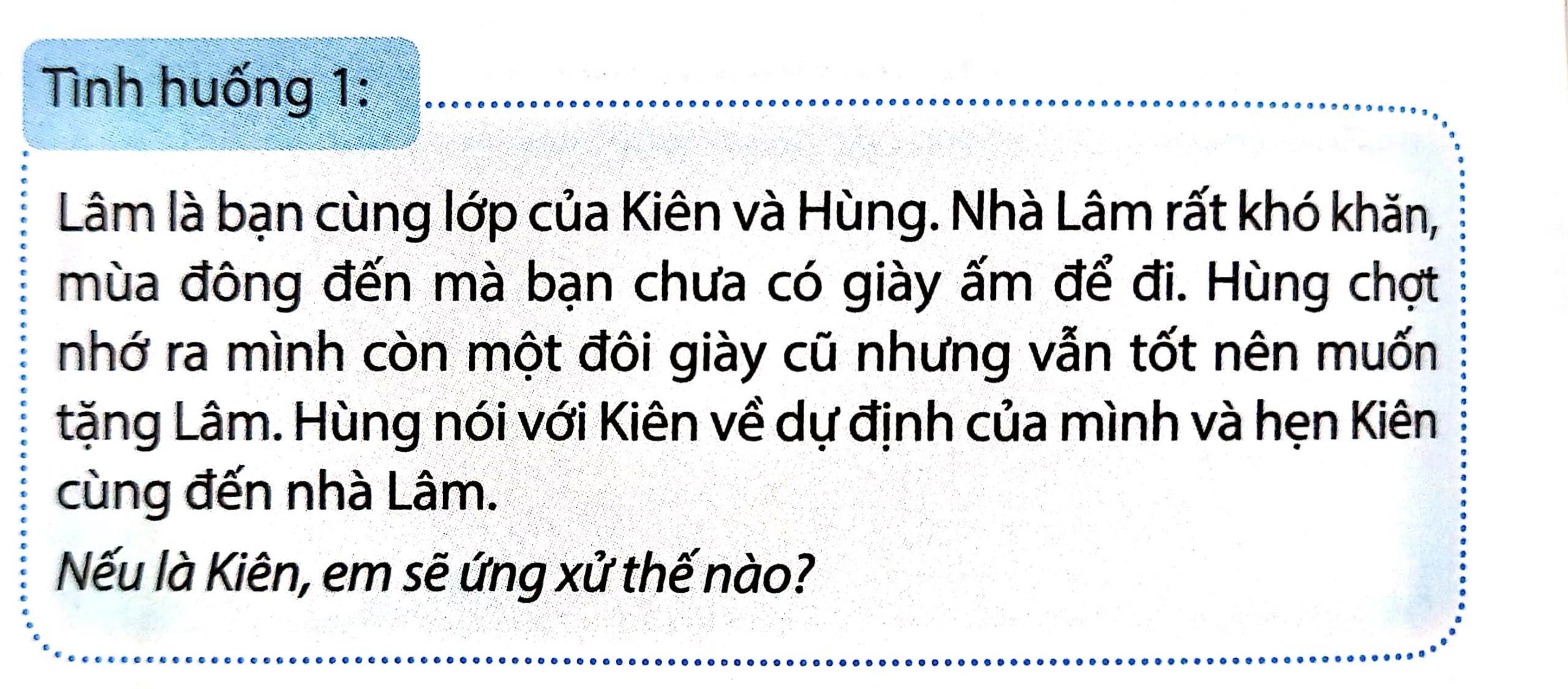 Vì nhà Lâm rất khó khăn, nên nếu em là Kiên, ngoài cùng Hùng đến nhà Lâm để tặng giày, em sẽ kêu gọi ủng hộ từ các bạn trong lớp nữa. Sau đó cùng mọi người đi mua thêm một ít đồ cần thiết cho mùa đông để giúp đỡ gia đình Lâm.