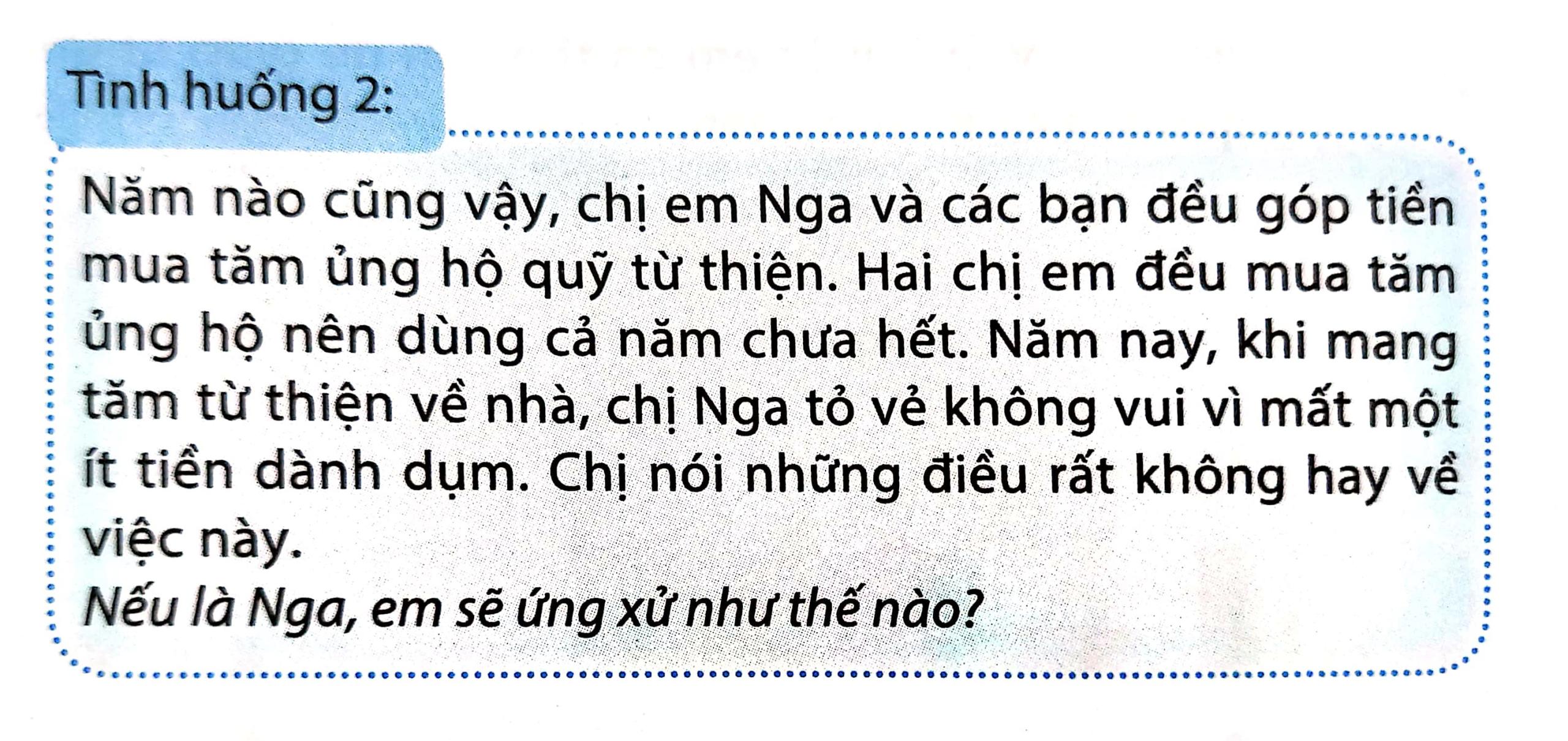 Nếu em là Nga, em sẽ giải thích cho chị hiểu tiền để mua tăm không nhiều, nhưng có thể giúp đỡ cho những mảnh đời bất hạnh ngoài kia. Tăm mình dùng không hết có thể đem đi biếu, tiền hết rồi mình có thể dành dụm trở lại, nhưng nếu mình không giúp đỡ thì những mảnh đời ngoài kia có thể sẽ thiếu thốn đủ điều. Từ đó khuyên chị nên giúp đỡ được gì thì giúp, không nên tính toán vì hoàn cảnh của mình còn tốt hơn nhiều người ngoài kia. Chúng ta nên học theo truyền thống yêu thương con người của dân tộc.