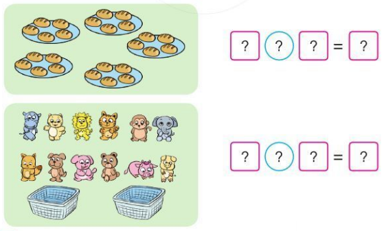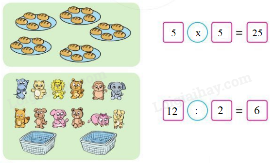 b) Quan sát tranh, đếm số cái bánh trên mỗi đĩa, số đĩa có trong hình rồi viết phép nhân hoặc phép chia thích hợp. Làm tương tự với hình thứ hai.