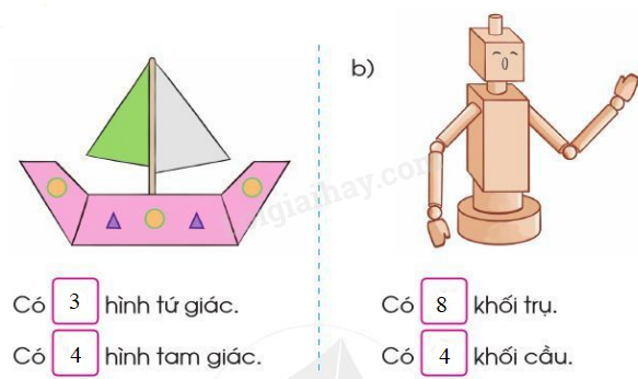 Quan sát hình vẽ, đếm số hình tứ giác, hình tam giác, khối trụ, khối cầu rồi trả lời câu hỏi.