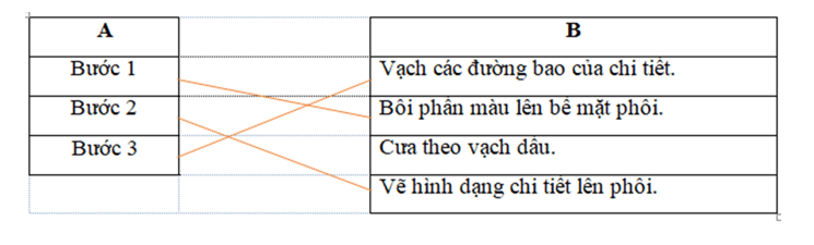 Em hãy nối thứ tự bước thực hiện ở cột A với công việc ở cột B để thể hiện quy trình vạch dấu trên phôi cho phù hợp.