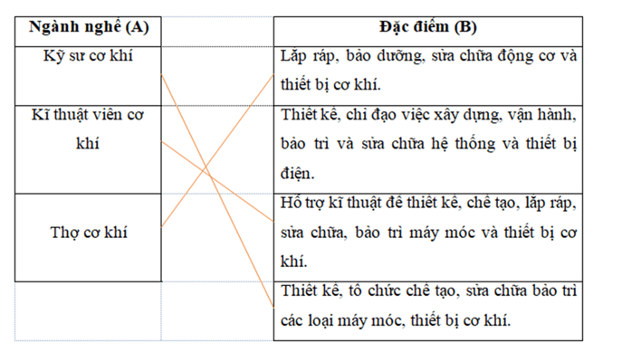 Hãy nối ngành nghề trong lĩnh vực cơ khí ở cột A với đặc điểm cơ bản của nghề ở cột B cho phù hợp.