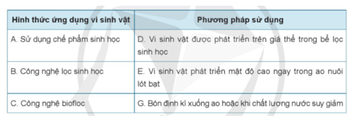 Hãy chọn các cặp đáp án đúng liên quan đến các phương pháp ứng dụng vi sinh vật trong xử lí môi trường nuôi thuỷ sản.