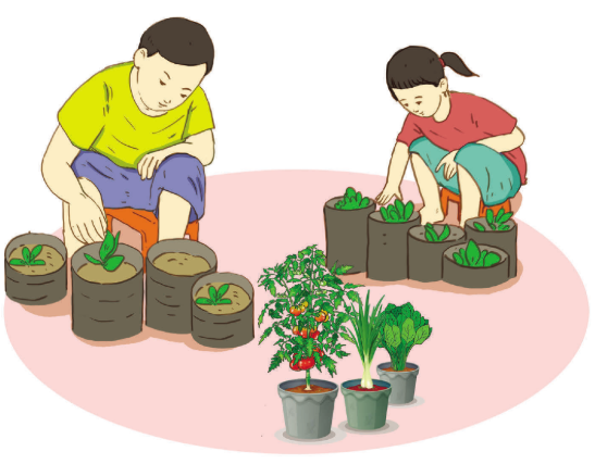 c) Chỉ các vật có thể dùng để trồng rau: li, bình, vỏ hộp, chậu nhỏ.