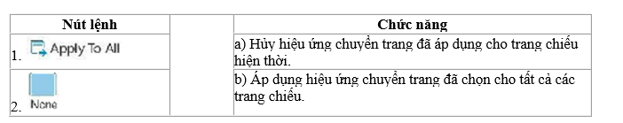 Sắp xếp các thao tác dưới đây theo thứ tự thực hiện tạo hiệu ứng chuyển trang cho trang chiếu.