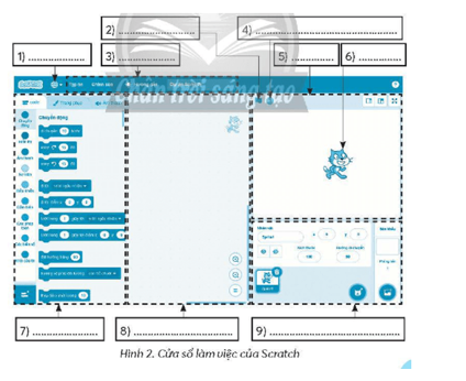 Điền cụm từ thích hợp vào chỗ chấm để chú thích cho cửa sổ làm việc của Scratch.