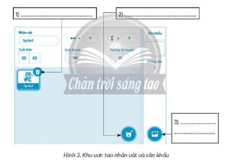 1) Nút lệnh xoá nhân vật, 2) Nút lệnh thêm nhân vật, 3) Nút lệnh thay đổi sân khấu (phông nền).
