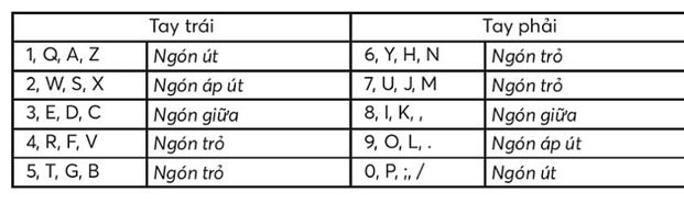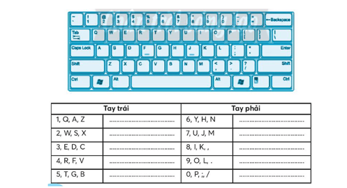 Điền vào chỗ chấm tên ngón tay tương ứng với dãy phím cho đúng với phân công gõ phím.