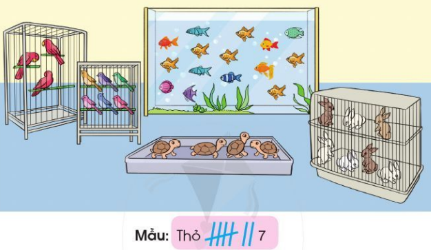 Xem tranh rồi đếm số lượng mỗi con vật và ghi lại kết quả theo ví dụ mẫu.