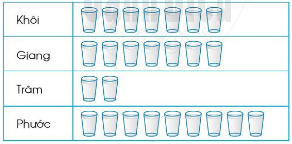 Quan sát biểu đồ tranh, đếm số cốc nước mỗi bạn uống được rồi trả lời câu hỏi.