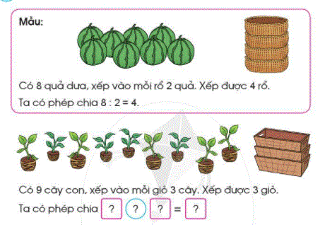 Lấy số cây con chia cho số cây trong mỗi giỏ ta tính được số giỏ.