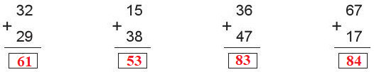\(\begin{array}{*{20}{c}}{ + \begin{array}{*{20}{c}}{19}\\{43}\end{array}}\\\hline{\,\,\,\,62}\end{array}\) \(\begin{array}{*{20}{c}}{ + \begin{array}{*{20}{c}}{47}\\{14}\end{array}}\\\hline{\,\,\,61}\end{array}\)