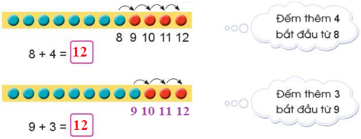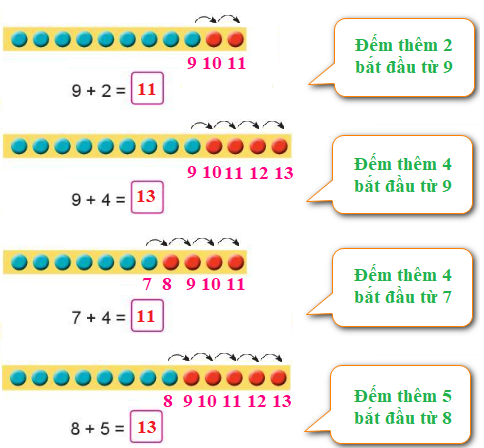 - Để tính 9 + 4 ta đếm thêm 4 bắt đầu từ 9.