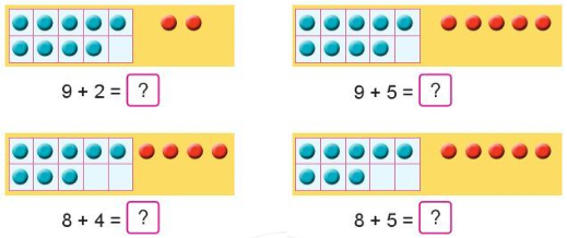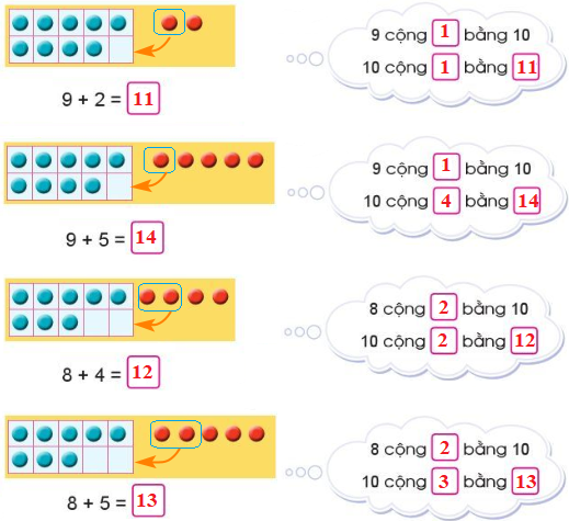 - Để tính 9 + 5 ta tách 5 = 1 + 4, lấy 9 + 1 = 10, sau đó lấy 10 + 4 để tìm kết quả.