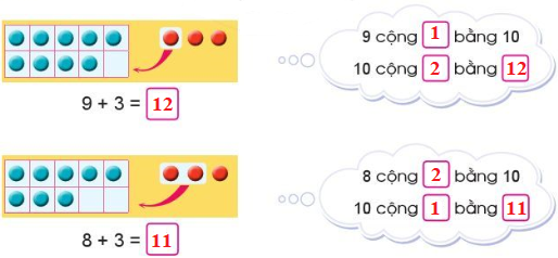 - Để tính 9 + 2 ta tách 2 = 1 + 1, lấy 9 + 1 = 10, sau đó lấy 10 + 1 để tìm kết quả.